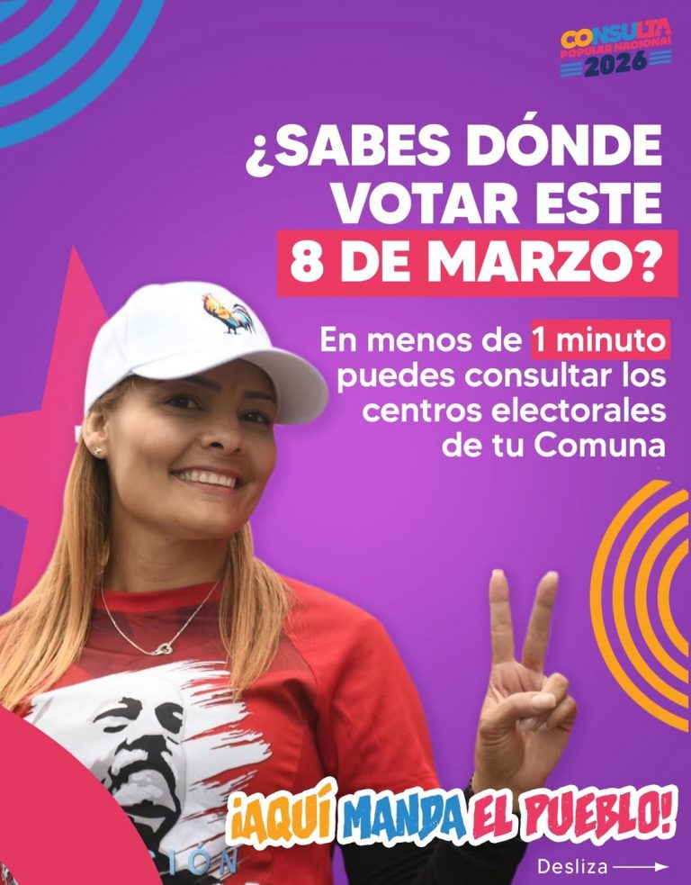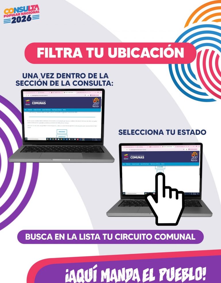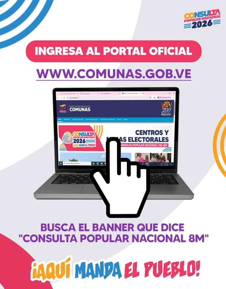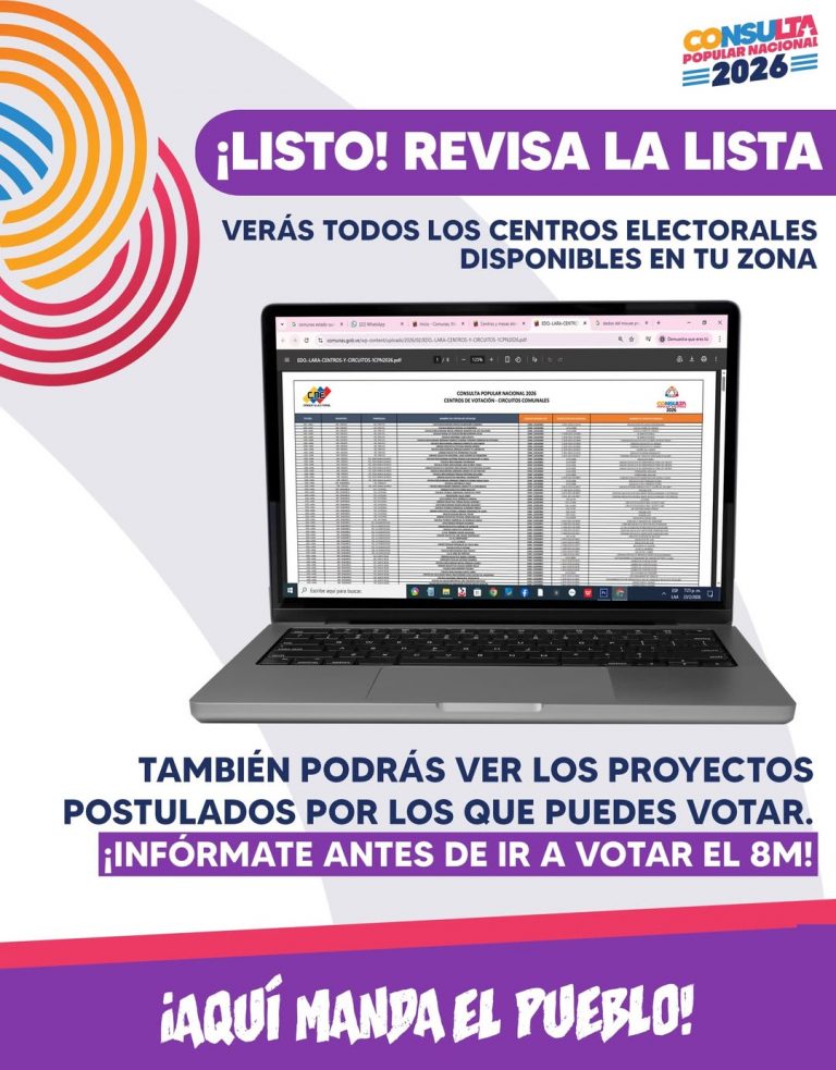 Con el objetivo de facilitar la participación protagónica en las comunidades, el Ministerio del Poder Popular para las Comunas y los Movimientos Sociales (Mincomunas). Habilitó una herramienta digital rápida y sencilla para ubicar los centros de votación en todo el país, de cara a la Primera Consulta Popular Nacional 2026 del próximo 8 de marzo, los electores podrán verificar la ubicación exacta de sus centros y los proyectos postulados en su Circuito Comunal.